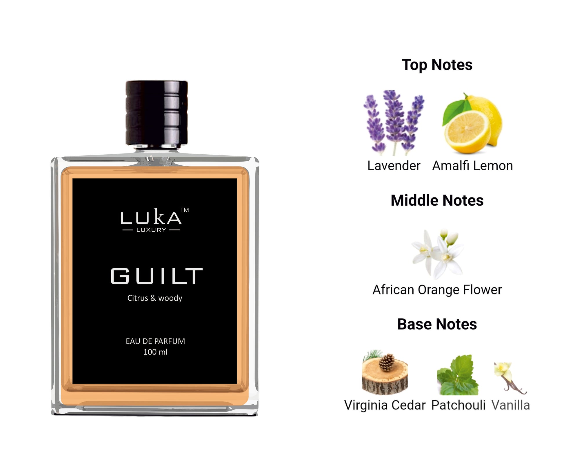 GUILT Eau De Parfum by LUKA is a Woody Aromatic fragrance for men. Youthful and pleasing fragrance. Great for use as a signature scent.