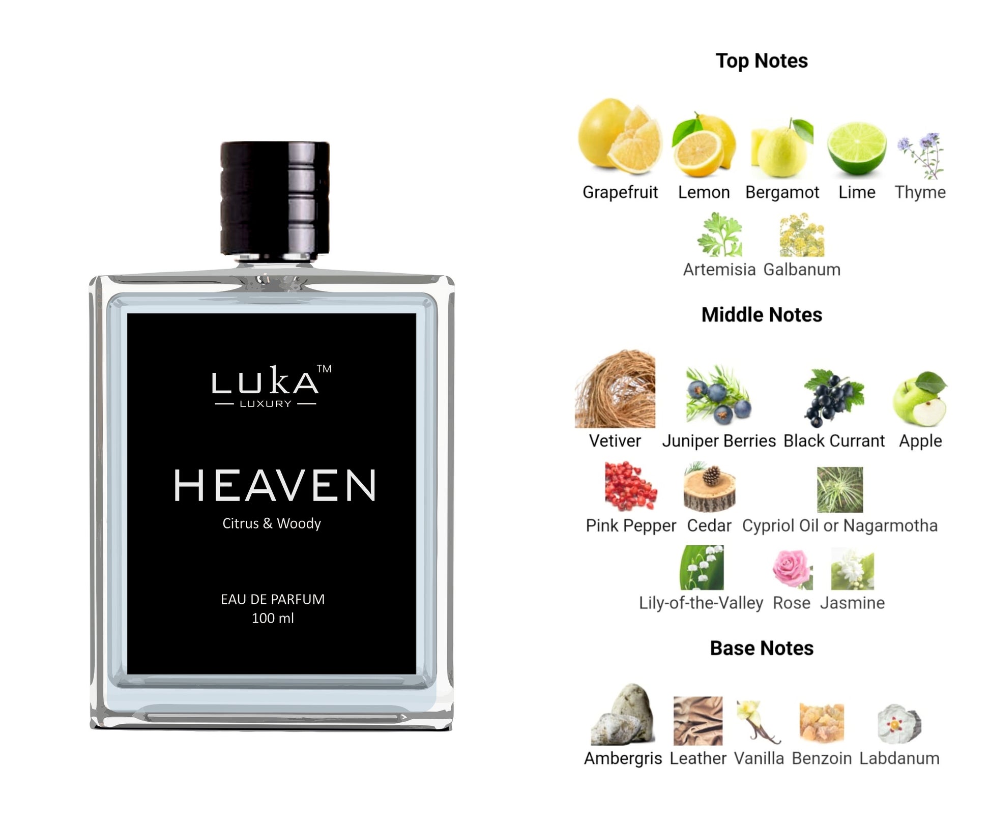 HEAVEN Eau De Parfum by LUKA is an Aromatic Fougera fragrance for men. The fragrance is Fresh and versatile.