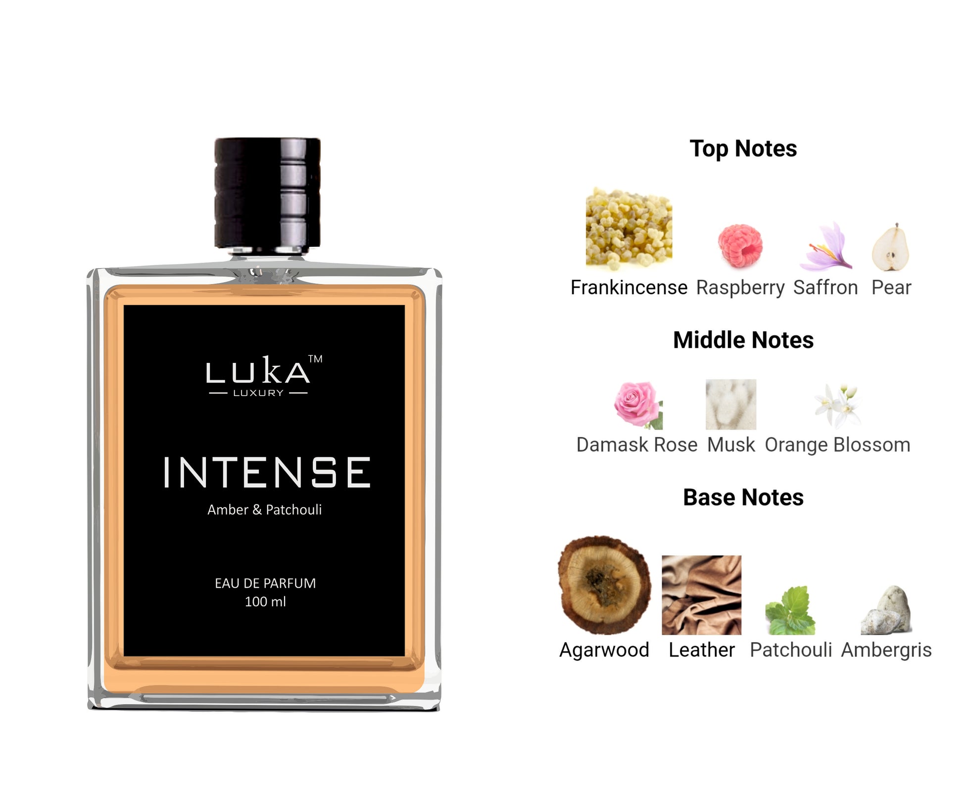 INTENSE Eau De Parfum by LUKA is an Oriental fragrance for men. INTENSE is dark, mysterious and intriguing.