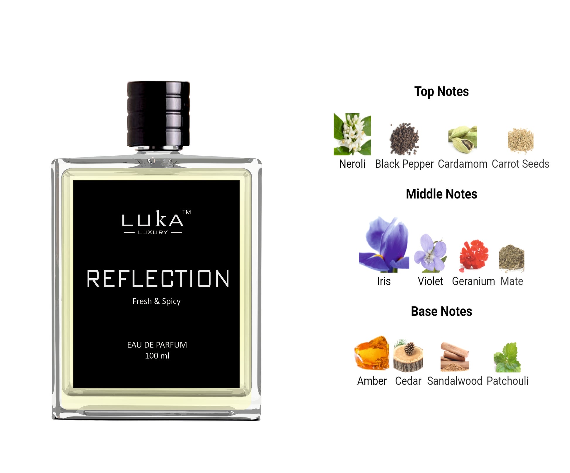 REFLECTION Eau De Parfum by LUKA is a Woody Chypre fragrance for men.The character of the fragrance is described as airy, reserved and challenging. Strong iris note in masculine fragrance.