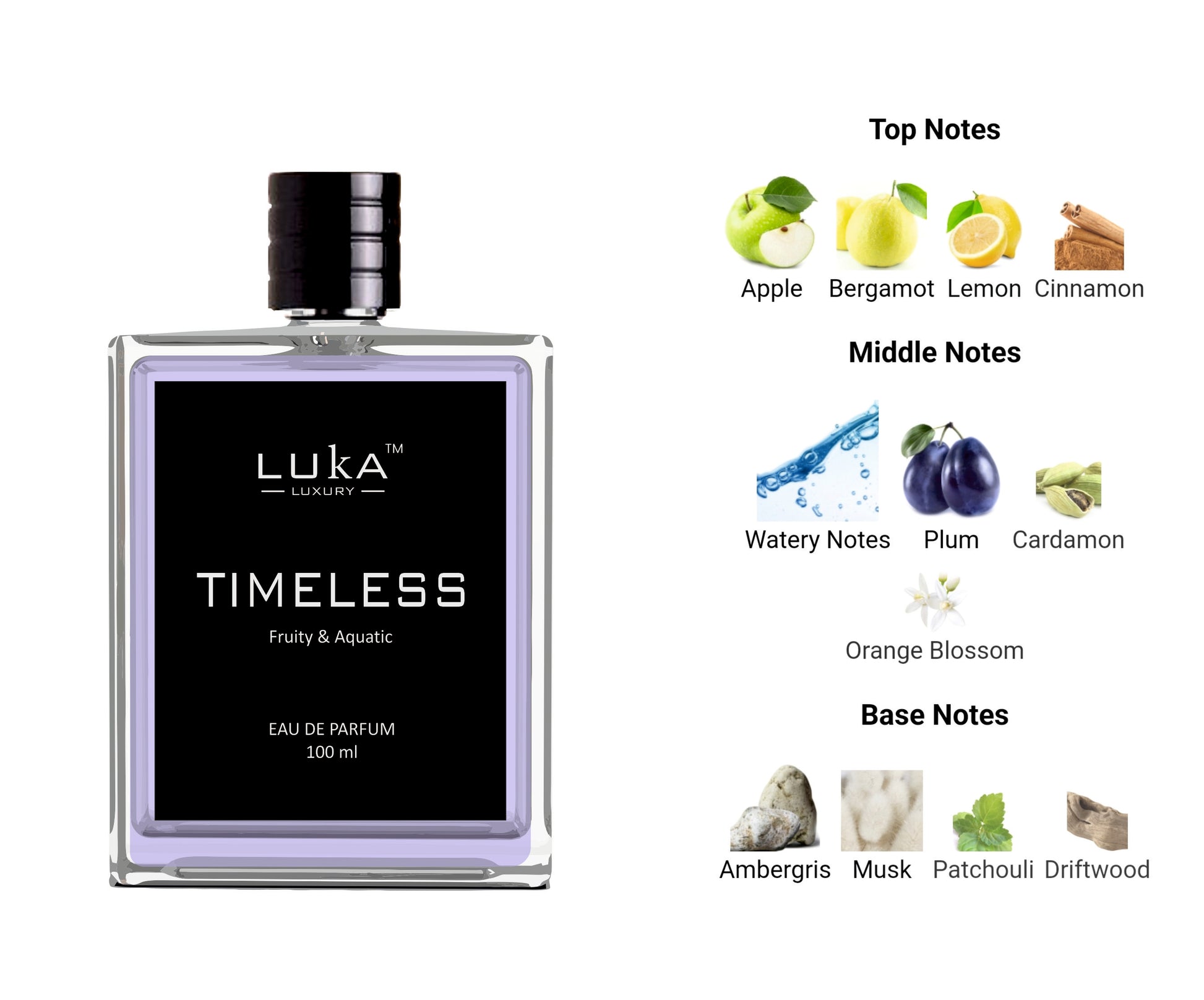 TIMELESS Eau De Parfum by LUKA is an Aromatic Aquatic fragrance for men. The fragrance captures the adventurous, exploratory and evocative spirit of the modern man.